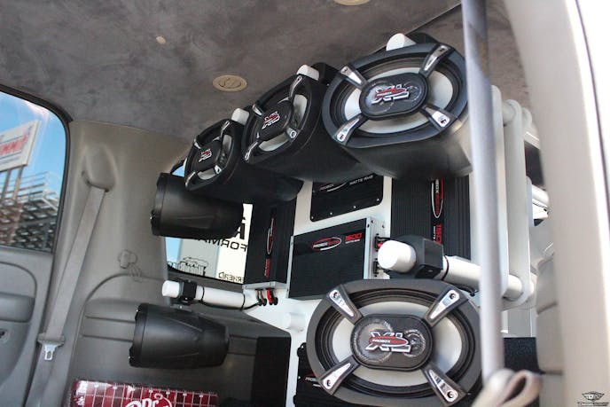 As we walked around the truck, we asked Randy Fugate, owner of the suburban, to open it up and take a peek inside. Opening the back hatch of the burb, and all we could see is stereo equipment. Eight subwoofers blocked the view of the rearview but, the mirror probably shakes enough that it’s not usable anyway.