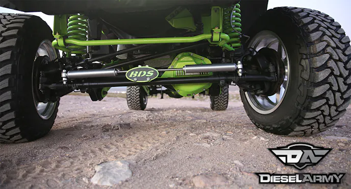 First up, was getting the right stance. Wing turned to his friends at BDS Suspension for some air support. To help Wing achieve his goal, they sent him their 8-inch lift kit, which converts the front suspension over to a 4-link and uses massive leaf springs in the rear (no blocks). With the truck and axle so far apart, new wheels and tires were a must.
