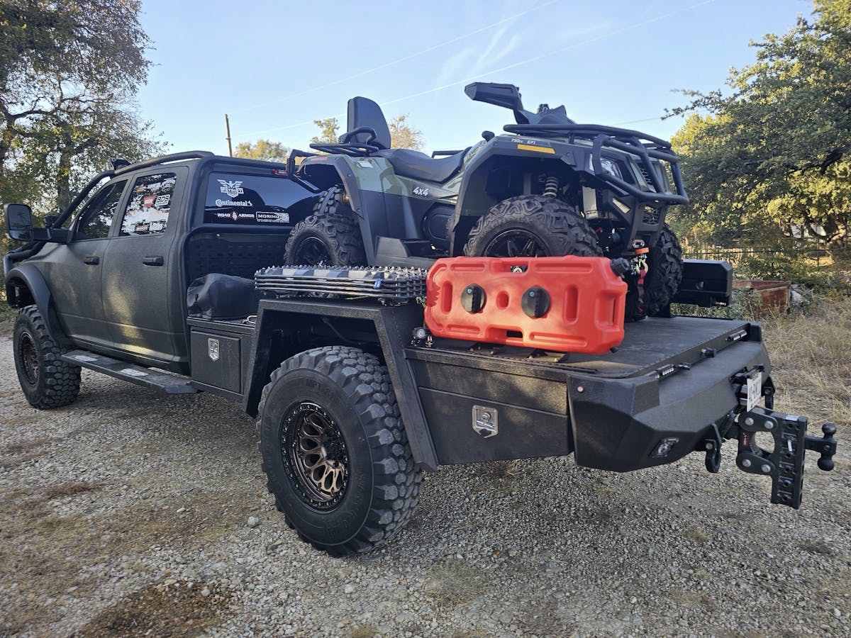 Most noticeable, Stephen ditched the factory bed in favor of a custom flatbed with built-in toolboxes. Flatbed trucks are straight-up cool, allowing for great flexibility and customization—and tons of room for activities. The flatbed has a custom spare tire holder (and tire), off-road jack, Midnight Forest water storage tank, 8-gallon gas tank, and more.