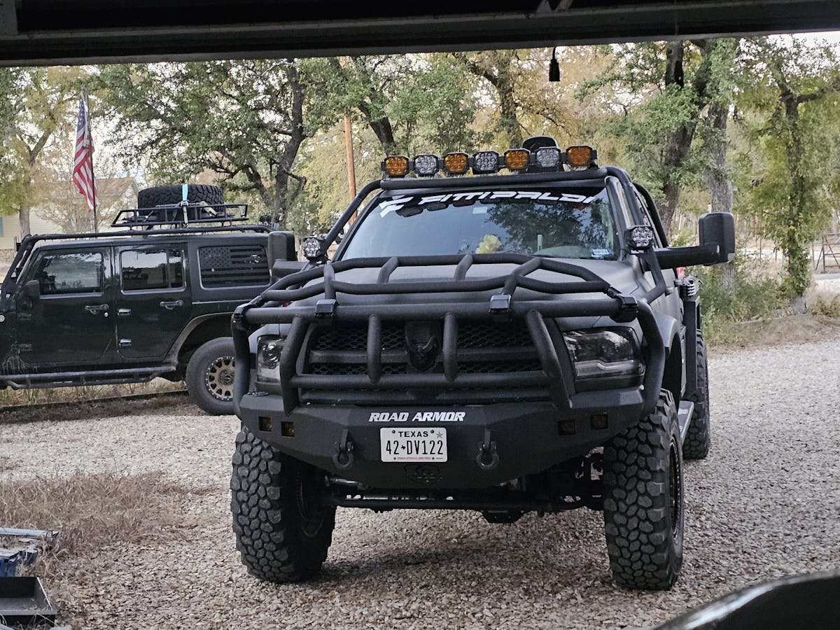 Patriot Liner sprayed the whole truck in bed liner, contributing to its menacing demeanor. Front and rear Road Armor bumpers, dual Warn winches (16.5 in front, M8000 in the rear), and a custom exo cage protect the massive truck and give it recovery capabilities. Lighting the way are Morimoto headlights, A-pillar lights, roof lights, rear-mounted lights, and tail lights, with Auxbeam controlling all the lights and accessories.