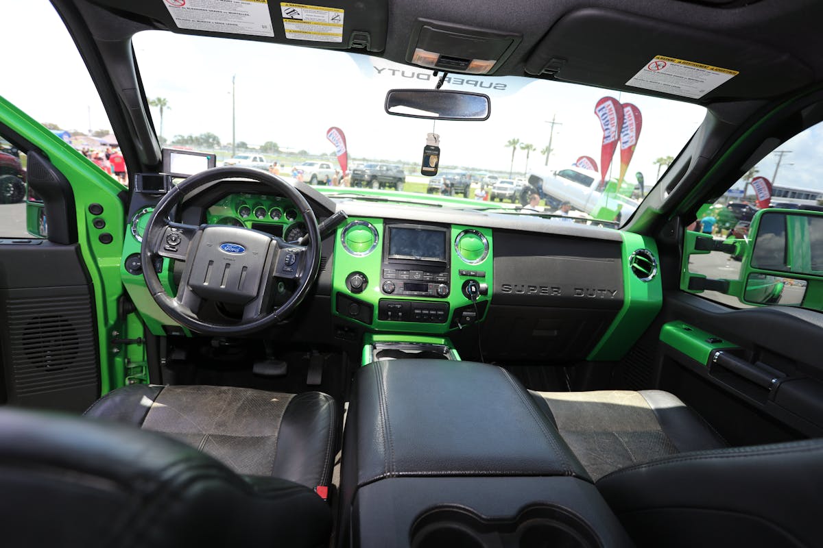 However, P.J. didn’t let Risoldi have all the fun, as he is also comfortable with a wrench in hand. He swapped out the stock F-350 fenders for a pair of F-550 front fenders. The inside of the truck is completely stock, but P.J. did add Synergy Green accents to the dashboard and the gauge cluster.