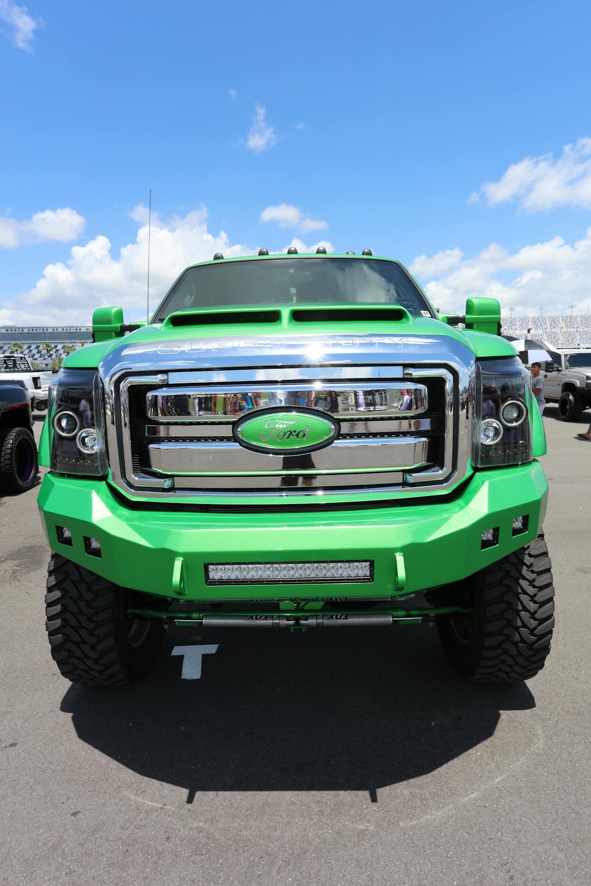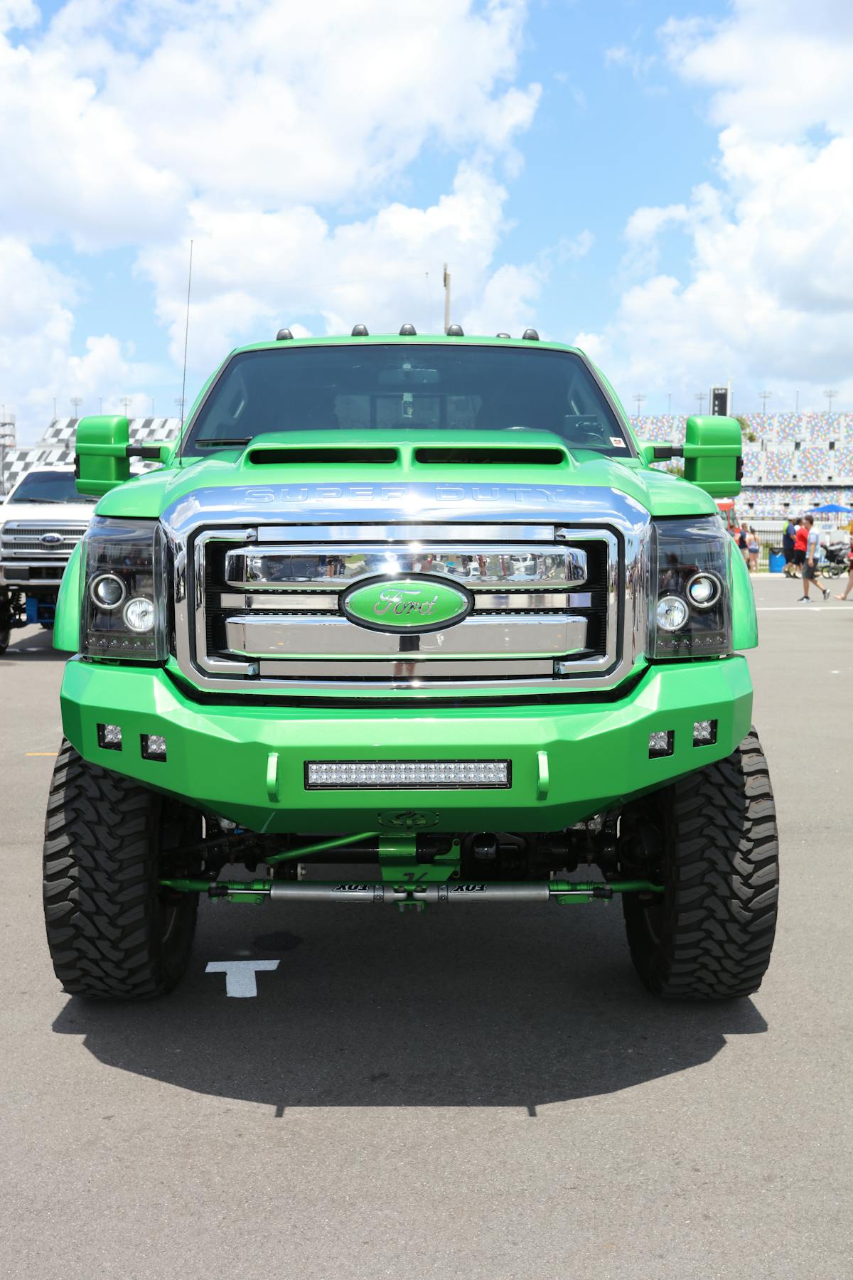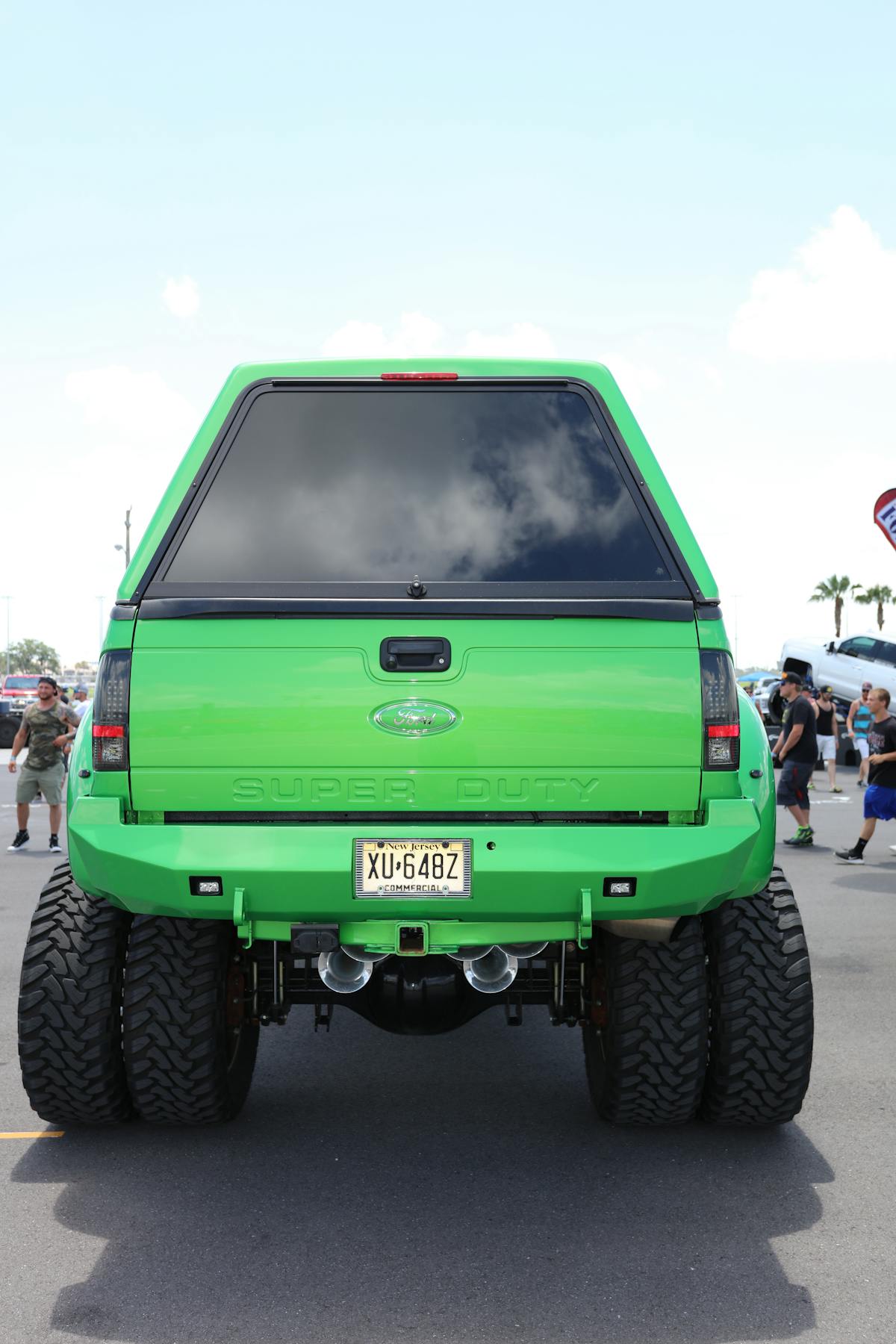This big green Ford F-350 is fitted with a Kelderman Air Ride lift kit, allowing for adjustment between 8 and 12 inches of height. The air suspension system includes dual Fox ATS shocks on the front and singles on the rear. P.J. told us that he recently added Fox steering stabilizers to the front of the truck. He did this just before the long, 1,500-mile drive down from New Jersey to Daytona, and it made the ride so much smoother, with hardly any wheel wobble. In fact, P.J. said that the truck rides just like a regular F-350, despite the oversized wheels and tires. However don’t try taking it to your local fast food restaurant drive-thru lane, as it won’t fit.