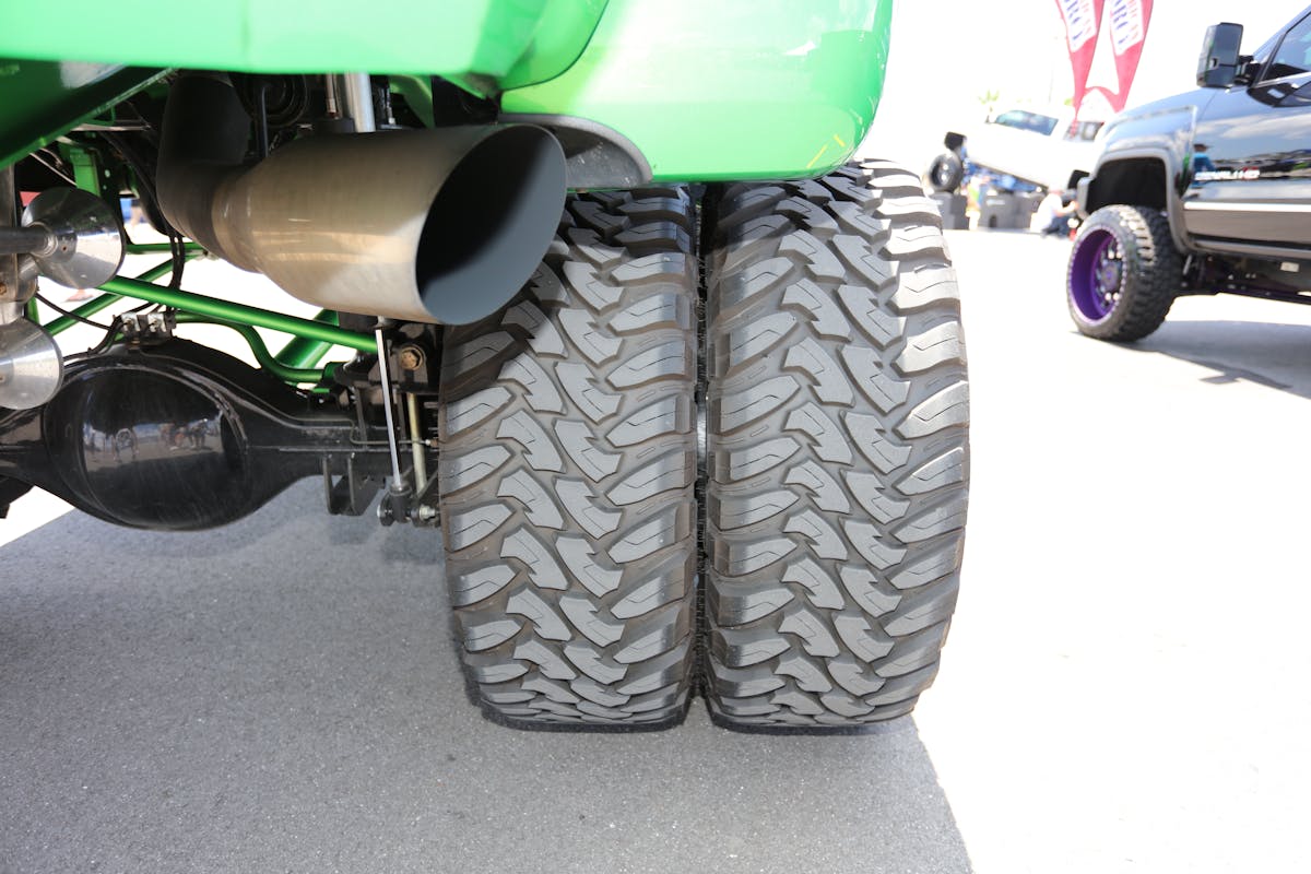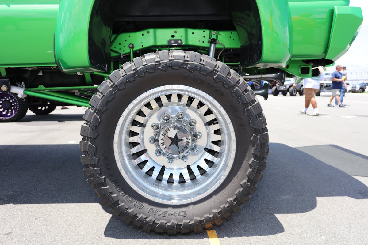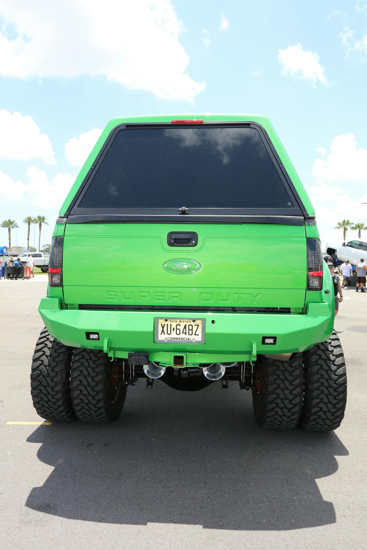 This big green Ford F-350 is fitted with a Kelderman Air Ride lift kit, allowing for adjustment between 8 and 12 inches of height. The air suspension system includes dual Fox ATS shocks on the front and singles on the rear. P.J. told us that he recently added Fox steering stabilizers to the front of the truck. He did this just before the long, 1,500-mile drive down from New Jersey to Daytona, and it made the ride so much smoother, with hardly any wheel wobble. In fact, P.J. said that the truck rides just like a regular F-350, despite the oversized wheels and tires. However don’t try taking it to your local fast food restaurant drive-thru lane, as it won’t fit.