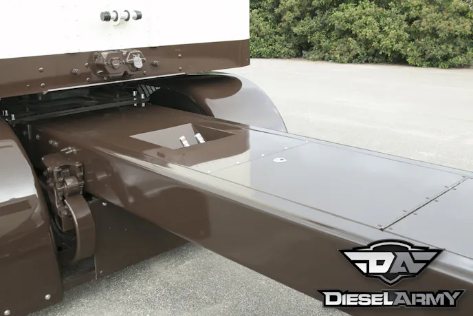 One big reason that Miller’s rig looks so good, are the number of subtle things. He added 12 Ga. Customs skirts to hide the frame between the sleeper and the fuel tank. Pickett Customs created custom panels between the fuel tanks and in front of the rear axles. He also had them fabricate a custom light bar for the back of the truck. While Pickett was fabricating all of the panels, Miller had them shave the frame to remove any bolts or other parts that stuck through. Then he had deck plates made between the frame rails to create a smooth finished look.