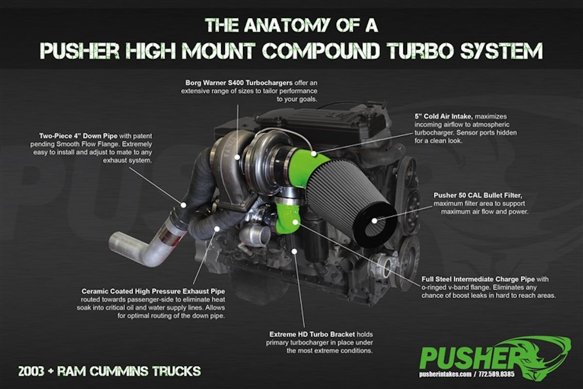 It seems as if there are quite a few questions about compound turbos and the diesel engine. Enthusiasts know what they are but most still have questions. Many can recognize what compound turbos look like but don’t know how they work and I think it’s important to set the record straight with some of the industry’s experts. For this piece, I’ll be working alongside Jacob Allenbaugh, owner of Pusher Intakes, to see what we can learn about compound turbo systems in today’s world.