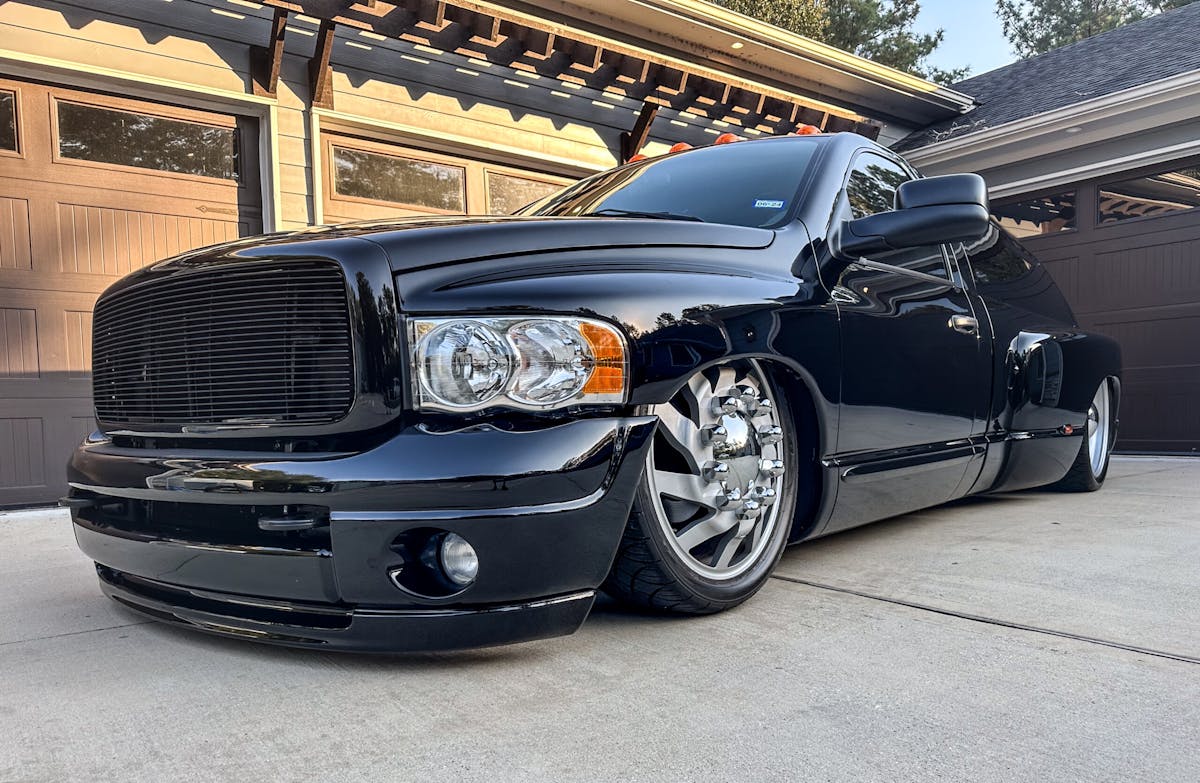 The 2004 RAM 3500 Dually you see here belongs to Todd “Radar” Hendrix from Conroe, Texas, who is no stranger when it comes to modified vehicles. If the name sounds familiar, it might be because Radar is one of the owners of Lone Star Throwdown (LST) and Classic Truck Throwdown, which are both massive shows held annually in Conroe, Texas. He is also part owner of Garage Gear Clothing, where he travels the country going from show to show setting up the vending trailer to sell merchandise. Radar has also been in the custom truck world for a long time and is also considered one of the OG guys in the mini truck world. He has had a few features in magazines over the years, so has always had some level of custom trucks in his rotation.