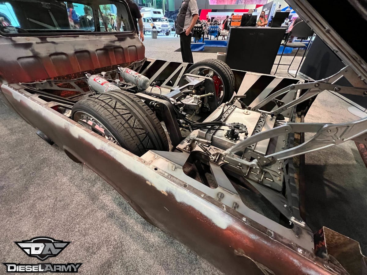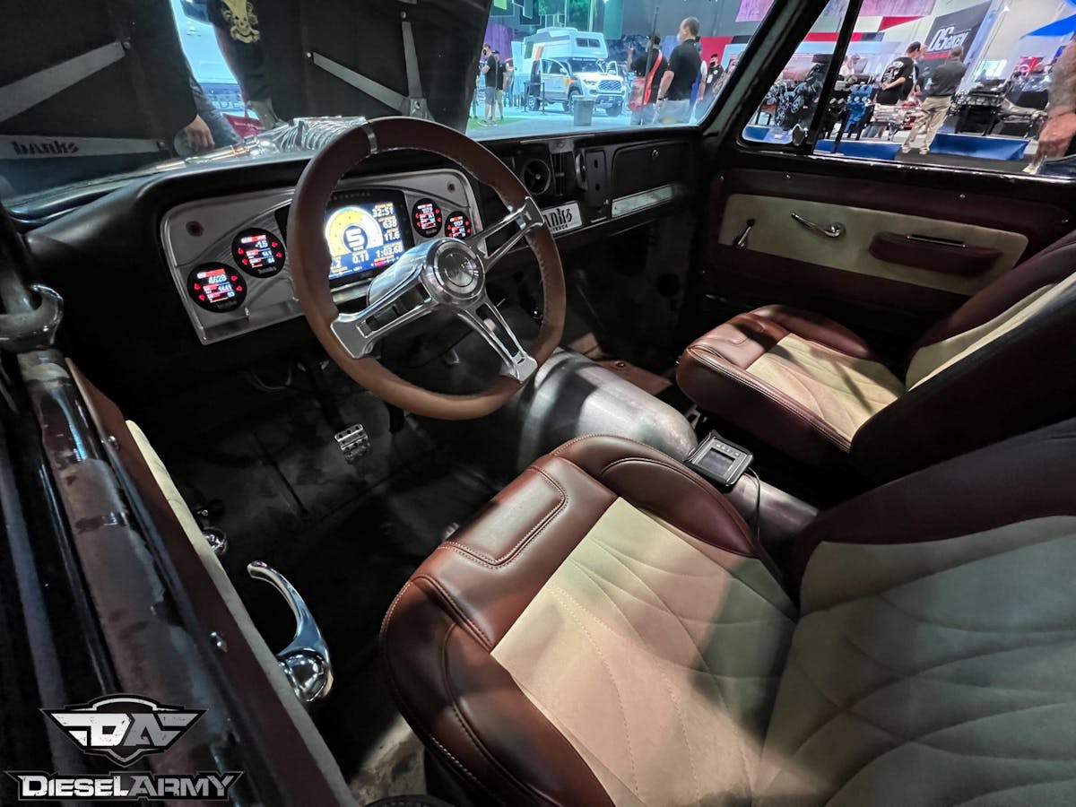 Nestled under the lights at the AMSOIL booth, “LokJaw” has every add-on you can imagine. If you like shiny, wide wheels, you’re in heaven. If you like a reverse-tilt bed that shows off a one-off rear bed support design, same. On the inside of LokJaw is a rejuvenated interior with TMI’ Product’s automotive-grade vinyl material with contrast suede inserts in their Pro Classic Seats with matching door panels, a modernized dash that features all of the data acquisition you could ask for, and an engine bay that will take your breathe away.