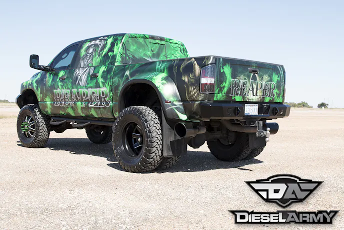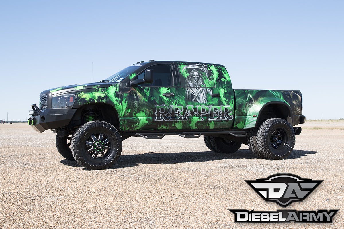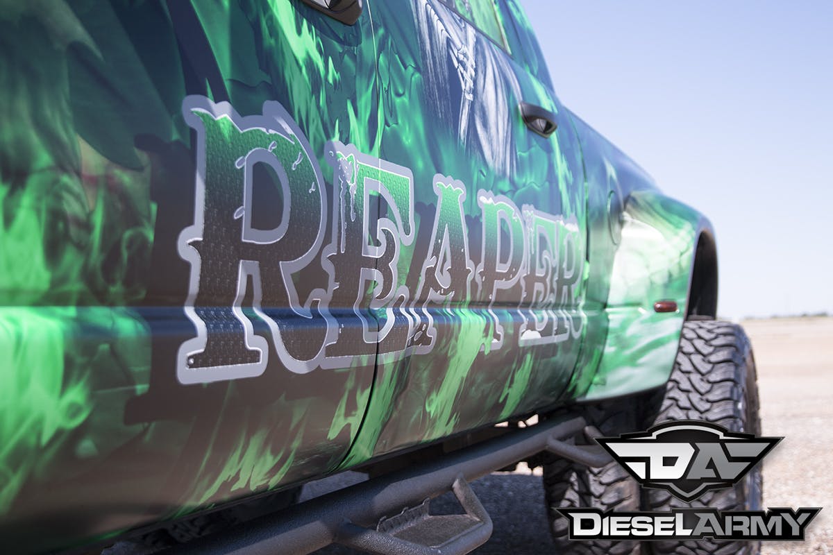 The most in your face aspect of the truck has to be the wrap. Graffix Xpress out of Odessa, TX designed and installed the wrap. The Reaper theme is not only along the side of the truck, but the hood and top of the cab. No matter how you look at this truck, there is something looking back at you.