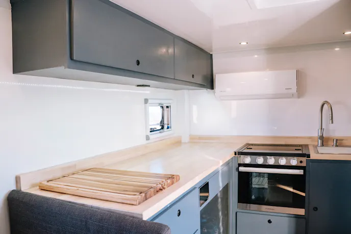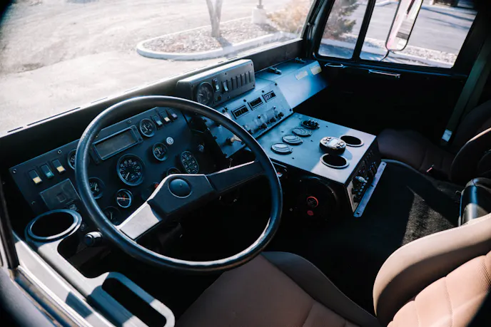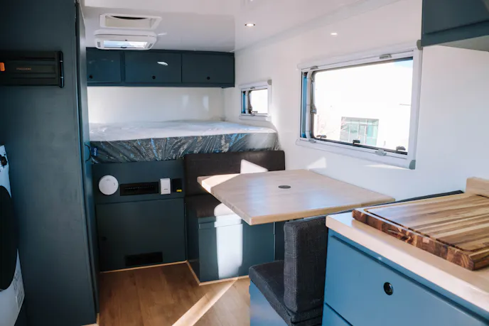 Inside the cab, Hunter RMV upgraded the standard three-seat layout with Scheel Mann leather seating, improving long-distance comfort while maintaining a functional workspace for the driver and passengers. The interior is finished with gray-painted solid-wood cabinetry and butcher-block countertops, creating a durable, practical living space.