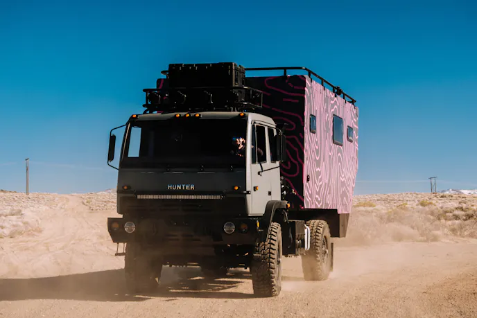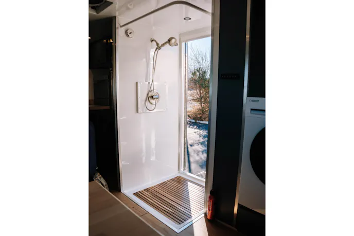 The Hunter RMV overland truck features both indoor and outdoor showers, providing flexibility based on weather and campsite conditions. The build includes a 100-gallon freshwater system paired with a 40-gallon graywater tank.