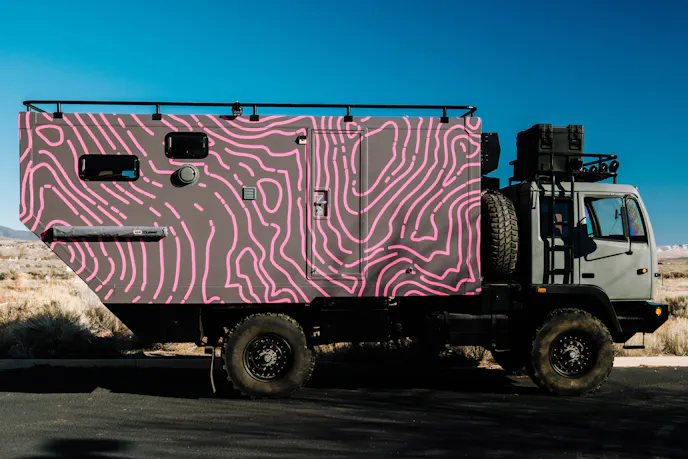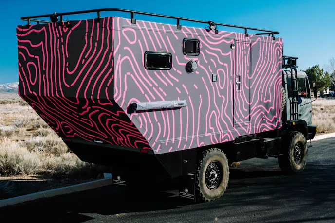 For this particular build, the customer supplied the M1078 chassis, which Hunter RMV completely refurbished in-house. The restoration included mechanical upgrades, fresh paint, and a fully redesigned living module. The exterior color scheme was inspired by the customer’s home terrain, using a topographical map file as the design reference for the custom 18-foot habitation box.