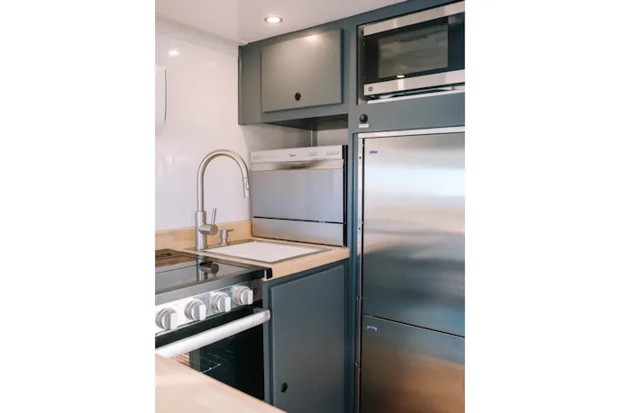 The living quarters reflect the company’s reputation for blending rugged construction with residential amenities. Appliances include a propane oven, refrigerator and freezer combination with an additional freezer unit, dishwasher, washer and dryer, and a Wrappon Trekker electric toilet. The amenities are supported by an off-grid power system built around a Victron energy management system, 1,800 amp-hours of lithium battery storage, and 1,000 watts of solar panels.