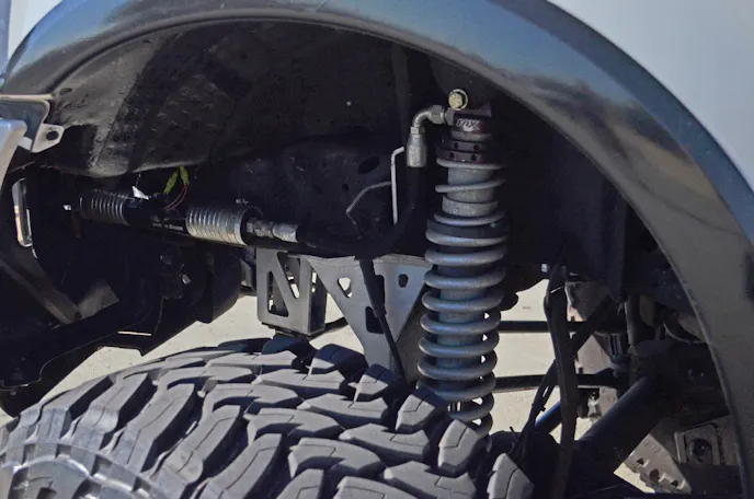 All of the suspension components are laser-cut and boxed for strength, and all four suspension links are fully adjustable with Kevlar lined spherical rod ends. Even the Panhard bar drop bracket and anti-sway bar brackets are heavily gusseted. Limiting straps are bolted in to make sure the Fox coilovers don’t overextend and shorten the life span.