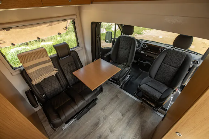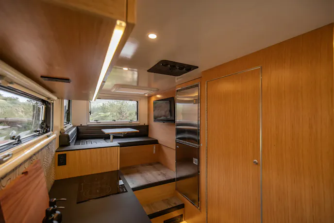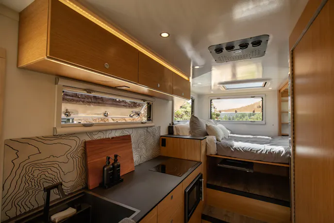 Step inside, and the Havn feels more like a modern apartment than a camper van. White oak cabinetry, Corian countertops, and white walls and ceilings create a clean, bright aesthetic. A queen-size Murphy bed, seating for four, and integrated blackout window covers ensure both functionality and privacy. The kitchen comes fully outfitted with a 220-liter refrigerator/freezer, Breville microwave/air fryer oven, and a dual induction cooktop, while a spacious 16-inch x 21-inch sink adds convenience.