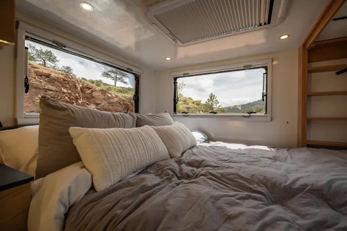 Unlike many camper vans, the Havn includes a full wet bath with a sink, shower, and Thetford cassette toilet. For those who prefer outdoor rinses, an exterior shower is also included. Combined with a 40-gallon freshwater tank, 16-gallon grey tank, and four-season insulation, the Havn is well-prepared for extended journeys in any climate. Heating and cooling are top priorities, with hydronic heat, in-floor heating, and a diesel-fired hot water system. Even in the coldest months, the Havn keeps you warm and comfortable.