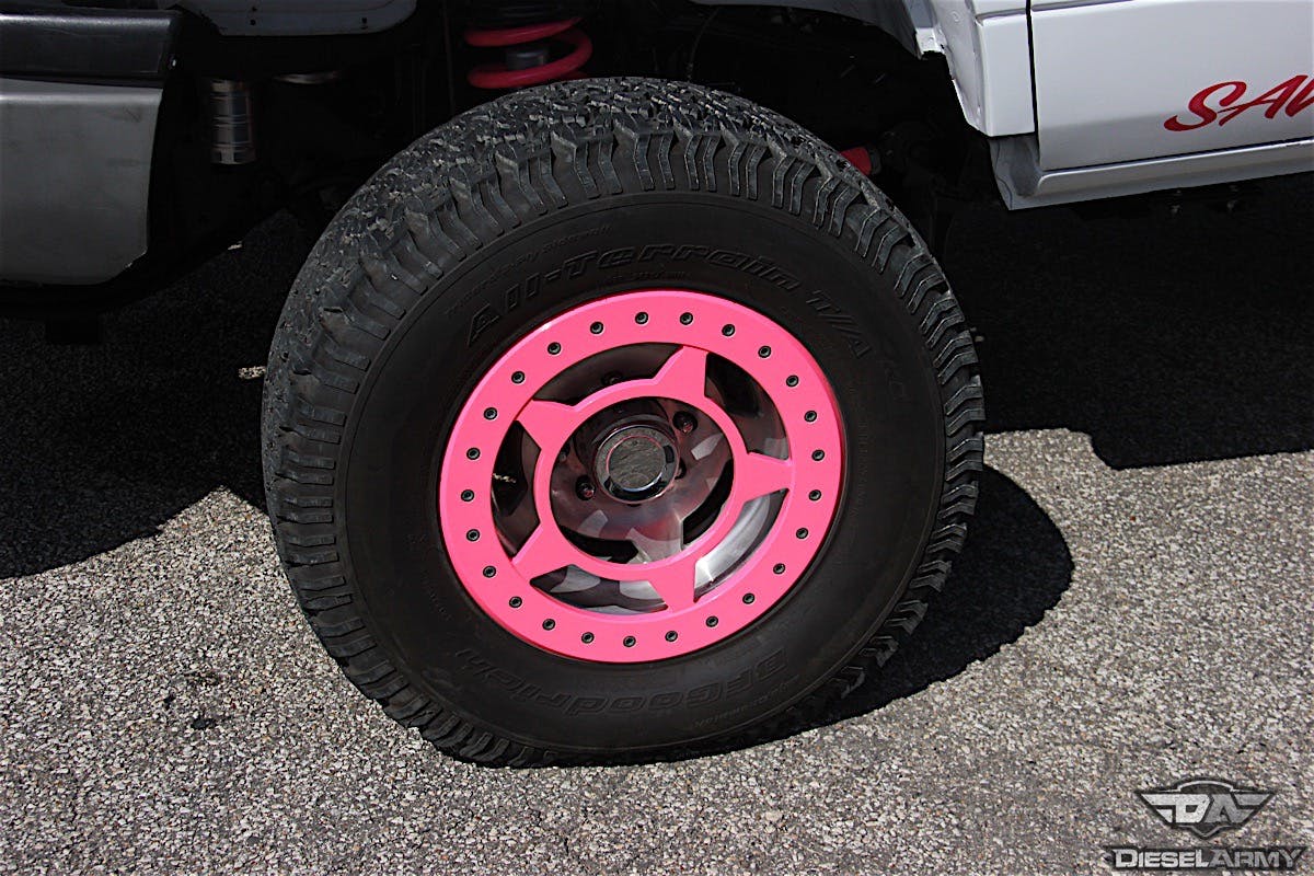 The front suspension on Save the Racks is stock height. To get the extra clearance needed for the slightly larger tires, a body lift was installed. This helps to keep the center of gravity low. The stock coils were painted pink to go along with the theme, and custom control arms were built with flex joints to handle the extra stress the truck sees. Of course, they were also painted pink.