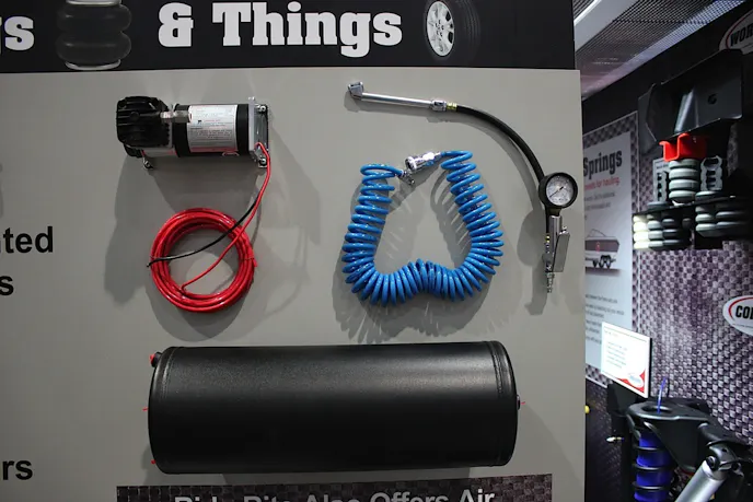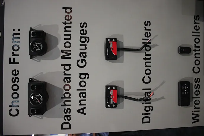 The board displayed dashboard mounted analog and digital gauges, as well as wireless controllers used to control the air spring system. A keyfob-sized device was extremely lightweight and compact, making it easily portable and convenient, while a larger tuner-sized one could be placed inside the cab or on a worksite to offer up to three preset spring rates, with detailed readouts onscreen as well.