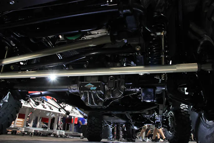 Other upgrades include an sPOD SE electrical distribution system, Warn Zeon 10s Platinum winch, and Factor55 flat link. There are also lights from Rigid Industries: a 50-inch light bar, DSS A-pillar lights, and A-Series rock lights. Out back, Teraflex supplied a heavy-duty tire carrier. Up front, the headlights are seven-inch round LED units from Truck-Lite.