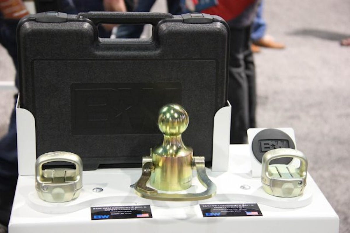 “This kit is supposed to complement the OEM prep package,” explained B&W’s Beth Barlow. “These packages are offered by all of the Big Three. Our kit comes with a tow ball, safety chains, and a plastic plug, all packed into a compact traveling case.”