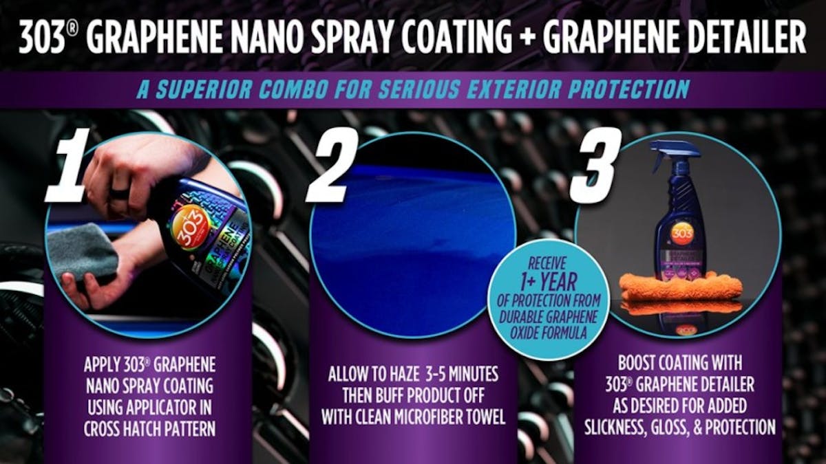 “On top of being able to use this as a drying aid, more importantly, the versatility of the 303 Graphene Detailer makes it safe to use on paint, chrome, glass, plastic trim, and wheels,” Galuska said. “This is a topper for our nanospray. This prolongs the protection and enhancement for up to another three months. Since we acquired 303 in 2013, we have attempted to spread the word and let people know we are safe on all applications.”