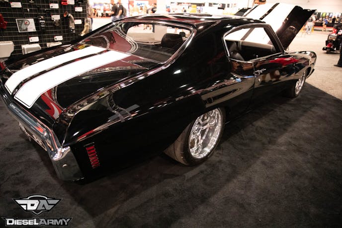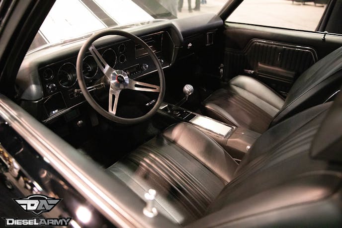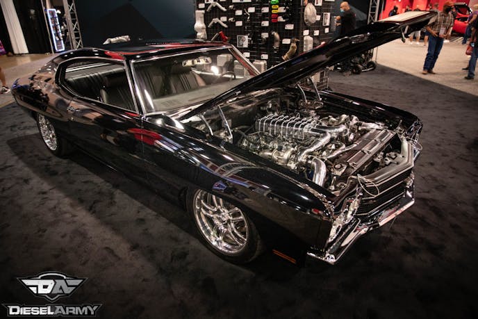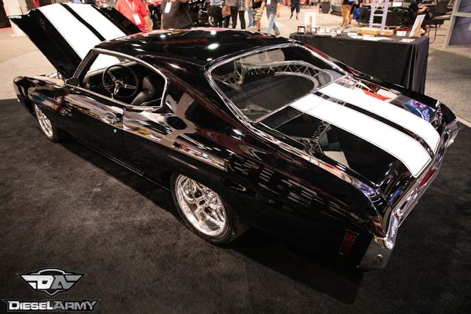 This beautiful black car is a 1970 Chevelle Super Sport that does not have an original 396 or 454 big-block. Instead, using a ton of their parts, they’ve stuffed a ’06 model, 6.6-liter Duramax engine in this bay, and man does it look right at home in there. It’s completely covered in chrome accents, and this Duramax looks mean. I talked with Andrew Solus about the car and his eyes lit up when I started asking questions.