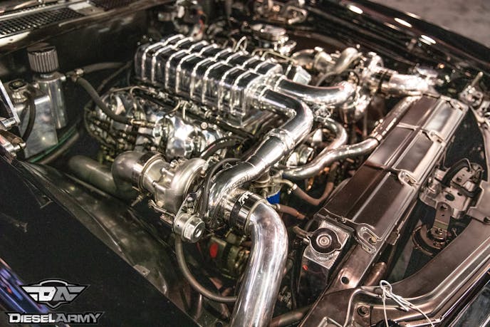 When I’m roaming the halls of the SEMA show, I am looking for the most unique and wilds builds out there. I was nearly blinded by the paint and chrome that was coming out of the Pacific Performance Engine’s booth today. Knowing the group’s heavy involvement with our industry, I just knew what I saw had to be diesel-powered. Sure enough, it was.