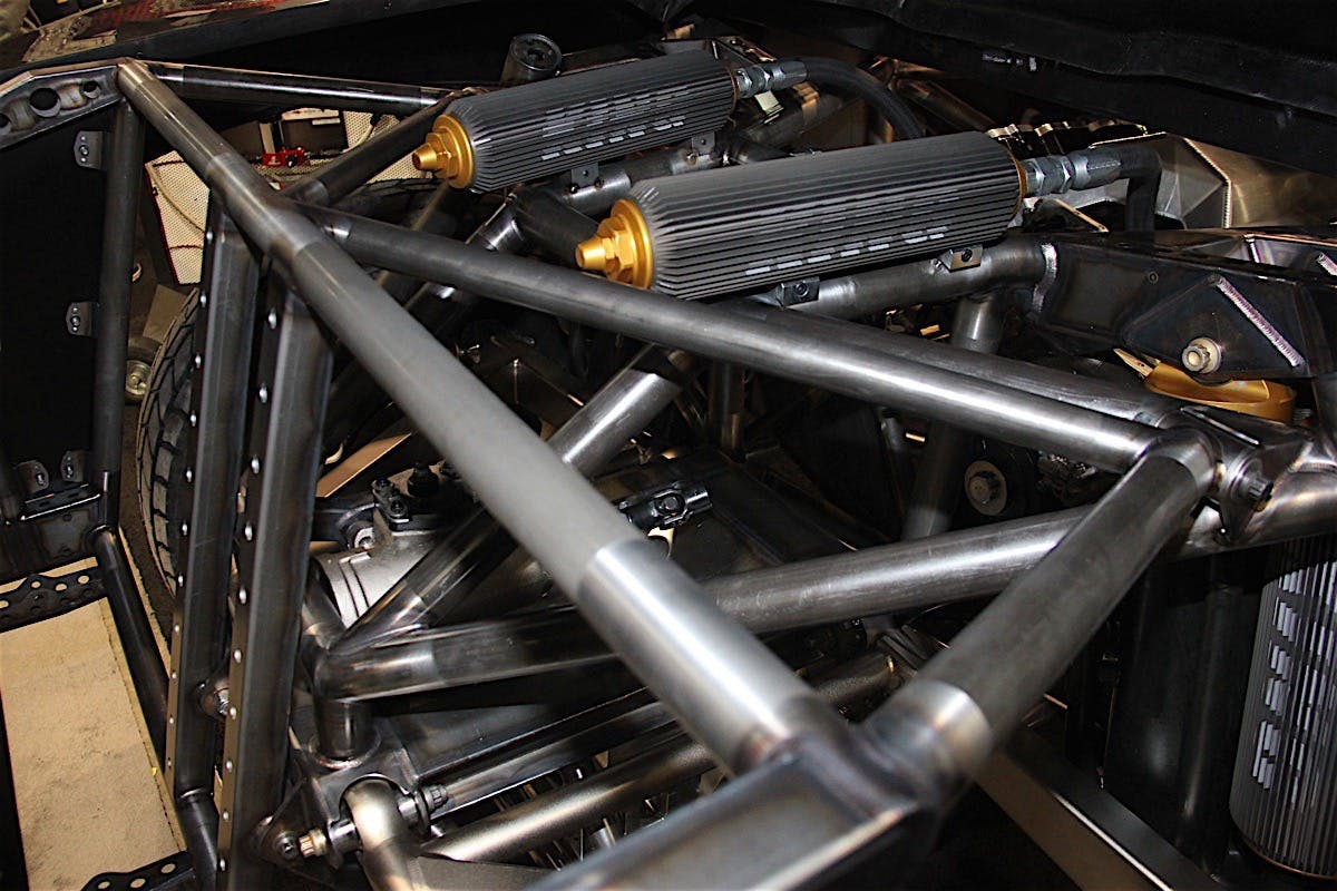 The drivetrain, a Wagler-built 6.6-liter Duramax and six-speed Allison 1000 transmission was mounted in a mid-engine fashion astride where the driver would sit. Two long tubes ran to the back, where we found the compound Precision turbochargers – one Pro Mod 98 atmospheric turbocharger, and two 62/66 high-pressure turbochargers – ready to give this vehicle an ungodly amount of boost. Fueling is an issue that desert racers must deal with in the strongest ways possible, and it looks like the MDD has it with a Battleborn-built 100-gallon fuel cell, Aeromotive 230 gph lift pump and regulator, and S&S Diesel CP3 fuel pumps (three of them) and injectors.
