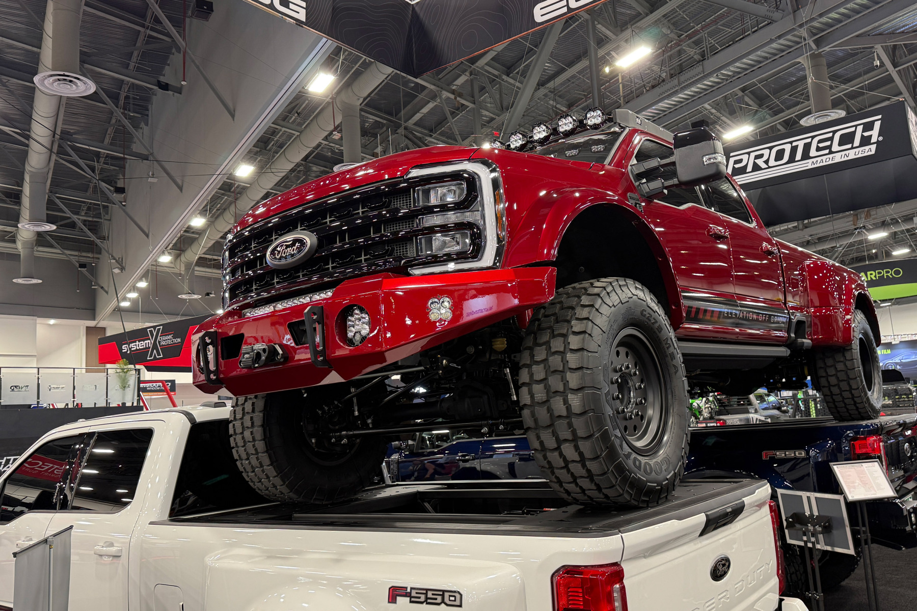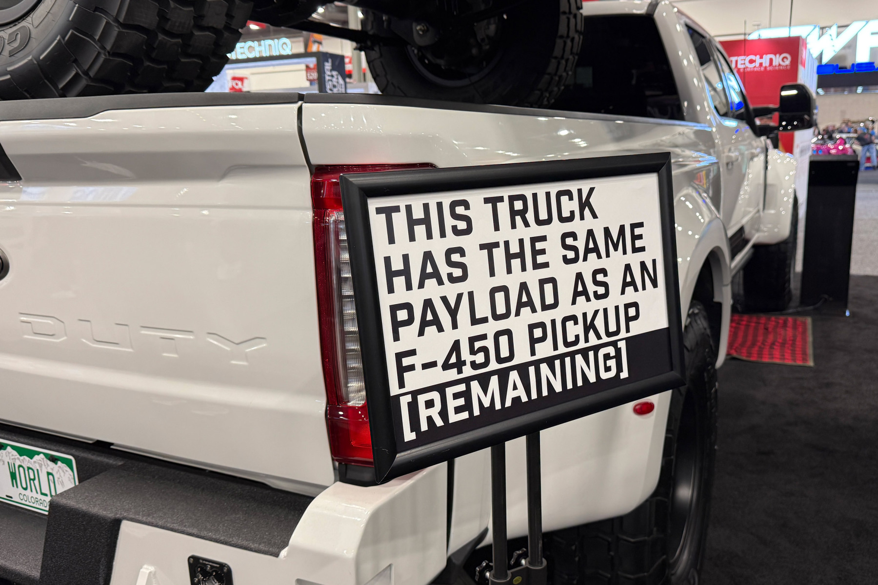 EOG claims these trucks have a payload in the ~9,500-pound range and towing up to ~30,000 pounds. To better visualize that payload—and for an extra dose of social media pizazz at the 2025 SEMA Show—EOG loaded one of its giant F-550 trucks perpendicular across the beds of two other builds. A placard stated that “This truck has the same (remaining) payload as an F-450 pickup.” That’s a big deal, as overlanders and off-roaders habitually obliterate payload ratings.