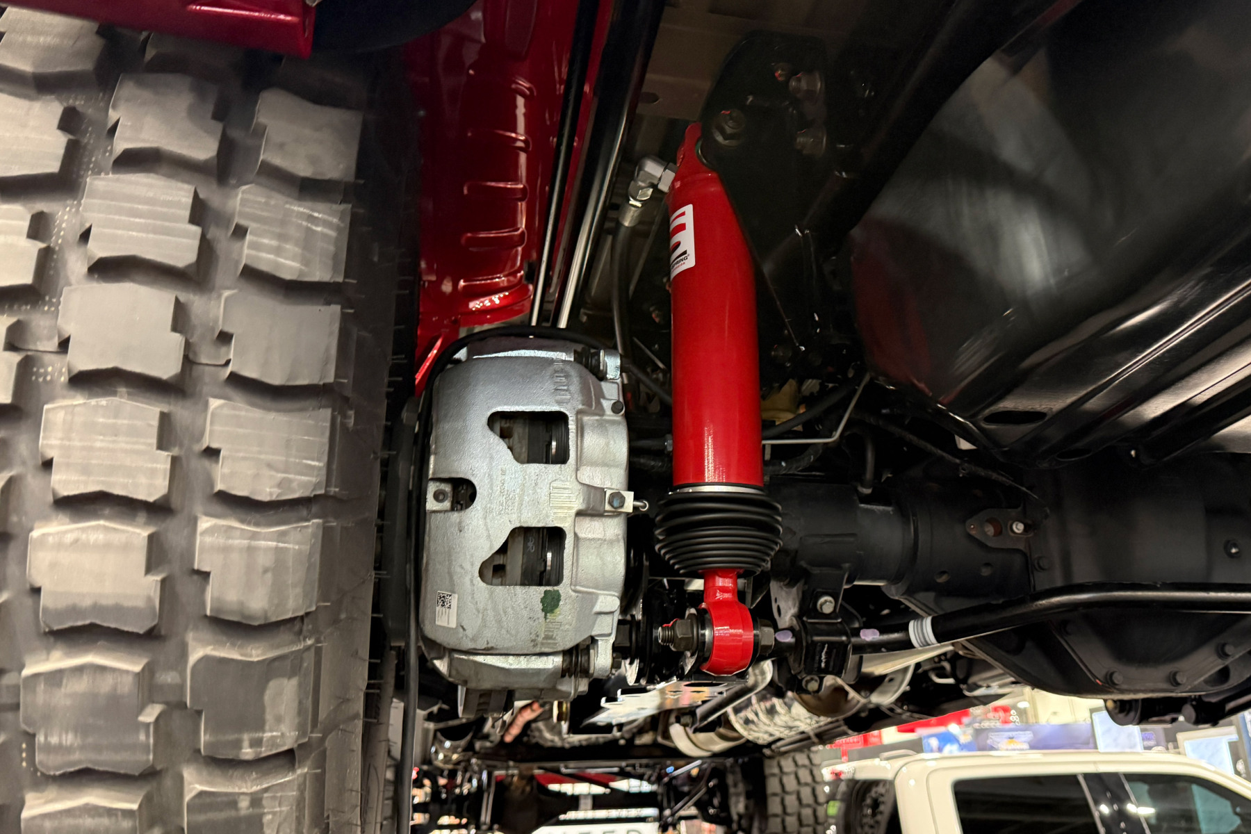 From the powertrain perspective, this platform continues to utilize the 6.7-liter Power Stroke diesel V8 and the 10-speed TorqShift automatic transmission. While that part is familiar to anyone in the diesel space, things really get interesting once you start talking tires and suspension. Elevation Off Grid Ford F-550 trucks run approximately 41-inch 335/80R20 tires. Many lifted trucks run 37s at best; fitting 41s while maintaining a low ride height requires significant clearance work. EOG seamlessly modifies various components (such as radiator support, rocker areas, and inner fender liners), and reroutes wiring. For off-road use, the lower the center of gravity, the better the handling, and this approach avoids the tall “show truck” geometry that usually follows massive tire diameter.