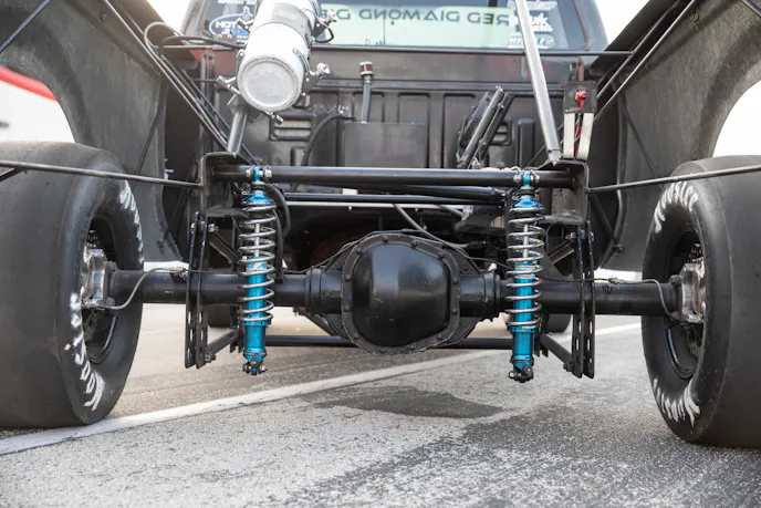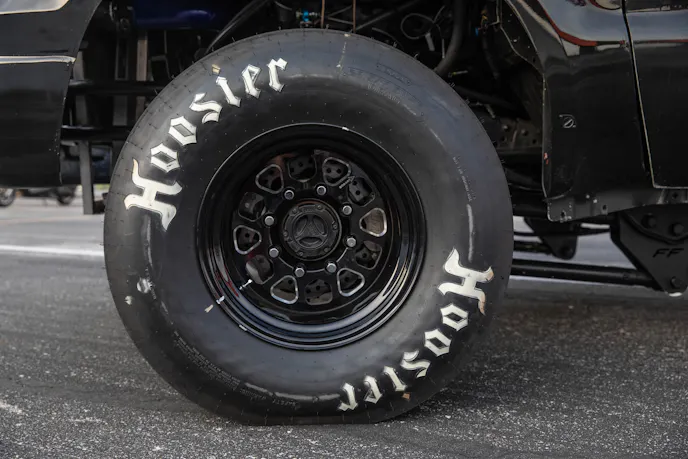 Denny’s got the power and the chassis but what does he use to get this all to stand planted? Using four 29.5-inch Hoosier slicks wrapped around a set of 15-inch by 12-inch Bogart Racing wheels, this truck has no issue staying planted to the ground. Spinning isn’t winning and with the help of these monster meats, there isn’t usually an issue.