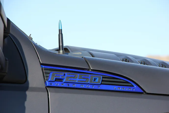 Indigo blue can be found all over the truck, contrasting with the sleek gunmetal paint.