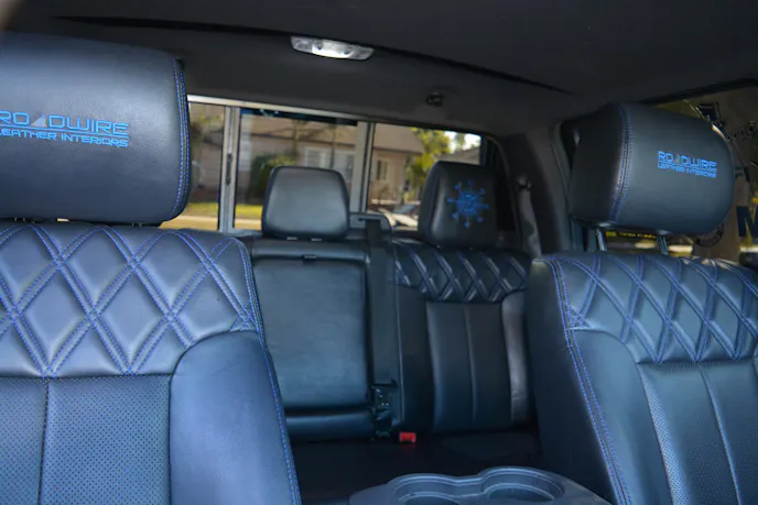 {link=http://roadwire.com/}Roadwire{/link} leather seats and custom blue accents give the interior of the truck a totally different feel than one would expect.