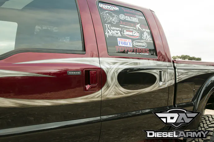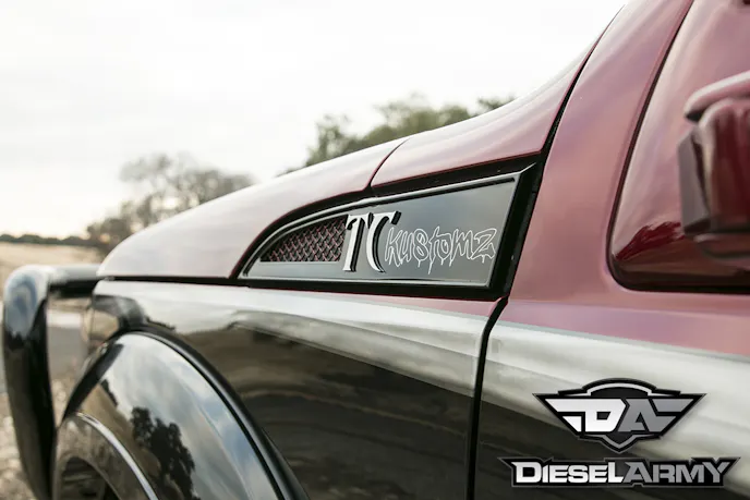 To set the truck even further apart, it was taken over to the guys at TC Kustomz for some incredible paint work. The paint scheme on this truck is one of Olivo’s decisions that really sets this truck apart. After the graphics were laid down on the side of the truck and the lower half painted black (the truck was originally red), they clear coated the truck with a number of coats. They then wet sanded the paint until it had a mirror like finish. You can run your hand along the paint and not feel a single seam or ripple where the graphics change. The mirrors were sanded down smooth and painted to match the truck. In addition to the paint job, all of the suspension, wheels and a variety of parts were dropped off at TC Kustomz for painting. With everything color matched, the truck gives off a polished and finished feel.