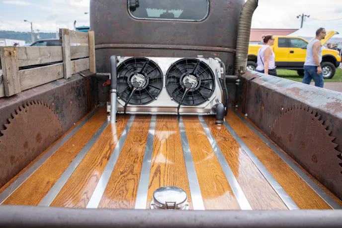 At first, I’m like okay, this is a really cool rat rod that someone has thrown together. I take a closer look and realize that there is a serious powerplant under the hoods. About that time, Salokas walks up and begins to tell me the story. Salokas has a background in diesel motorsports and this has actually been a father-son project. Even though TJ is more of a Power Stroke guy, his father said he needed a Cummins to make good horsepower. Well, here we are.
