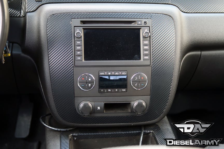 The interior of the truck is spruced up with a suede headliner and plenty of carbon fiber laid over the factory plastic dash and various panels. There’s not a lot of gauges or clutter, but a DSP switch for the EFI Live is just left of the steering wheel…and another switch controls the strobe lights. In the rear, he added Farenheit monitors in the rear headrests.