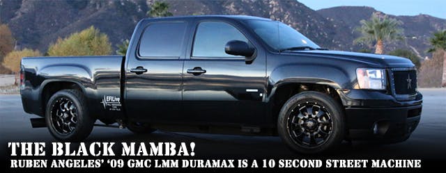 The Black Mamba is a snake in Africa that is one of the most dangerous and feared in the world because of its speed, unpredictable aggression, and the potent venom it delivers. One can say the same thing about Ruben Angeles’ 2009 GMC. People have come to call his truck The Black Mamba and it seems fitting as the truck hauls butt on the track and surprises plenty of competitors with its aggression and venom.