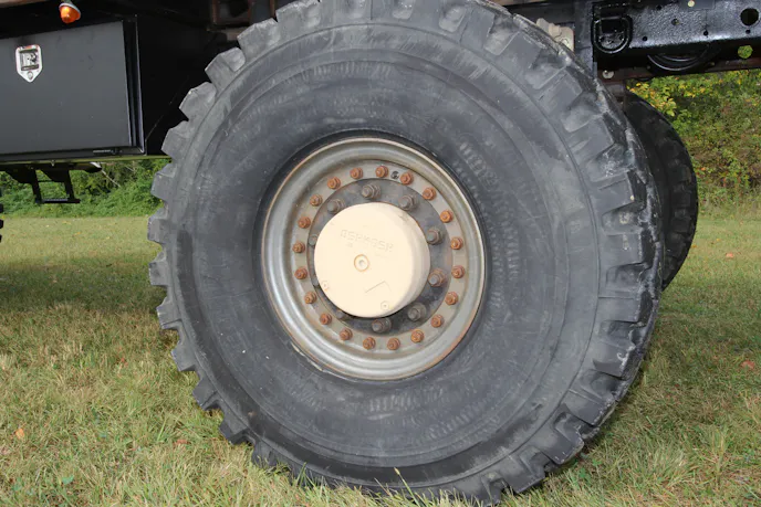 The truck rides on used 16.00R20 Michelin XZL tires mounted to 10-lug, two-piece, internal beadlock, run-flat wheels. Mounting them was a serious undertaking. Ethan notes it took three people 12 hours to mount just four tires, using pry bars, a semi-truck bead breaker, and even a forklift to get the job done.