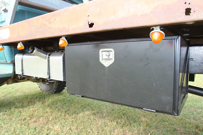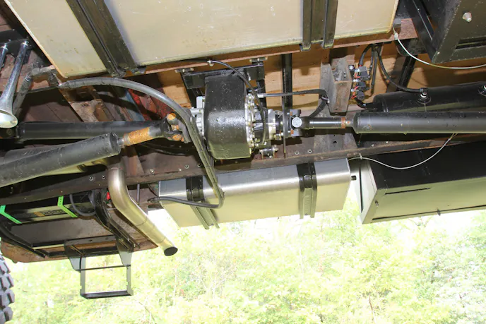 There are many more functional upgrades. Custom tubular crossmembers support the engine, transmission, and transfer case. Fuel is supplied by dual hand-built 35-gallon aluminum tanks. An air compressor and dryer from an 8.3-liter Cummins application manage the truck’s pneumatic systems.