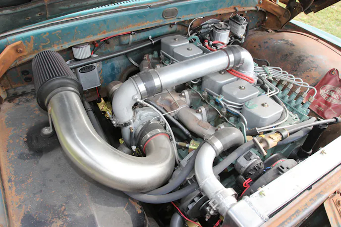 Out came the factory 361 cubic inch FE gas engine. In its place went a 12-valve Cummins turbodiesel sourced from a 1996 FedEx box truck. With just 69,000 miles, the engine was a solid foundation. Ethan tore it down to the long block, refreshed wear components, and upgraded it with a slightly larger turbo and an aftermarket three-piece exhaust manifold to address the known weaknesses of the factory unit.