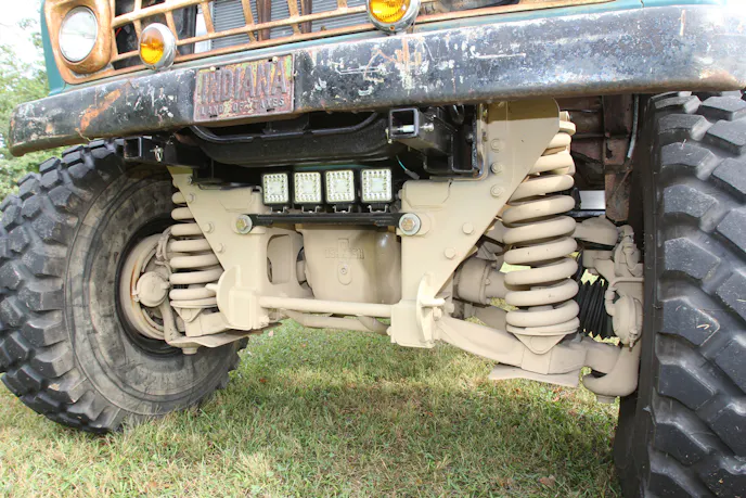 Fitting military-grade suspension under a 1960s Ford chassis is not a bolt-on job. Each TAK-4 cradle measures 39 inches wide, while the factory frame is only 34 inches across. Ethan modified the chassis by adding 2.5 inches per side to properly support each unit.