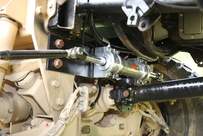 To run a front-application TAK-4 assembly in the rear, the differential was flipped and custom bars were fabricated to lock the steering spindles in place.