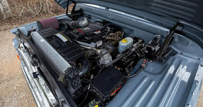 The real surprise comes when looking inside the truck. The original, very spartan interior was swapped for everything from a much more modern and comfortable 2010 Ram Laramie. One would not expect the interior to look like it came from the factory, but this melding of old and new is extremely well done. The dashboard, heated steering wheel, body control module, wiring, dual-zone climate control, trailer brake, and exhaust brake controls are all in place and functional.