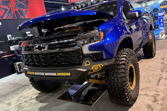 While many SEMA builds lean heavily toward aesthetics, this Silverado delivers legitimate capability beneath its polished exterior. The spool, whistle, and exhaust note—when paired with the long-travel suspension cycling over the massive tires—were enough to draw crowds all week long.