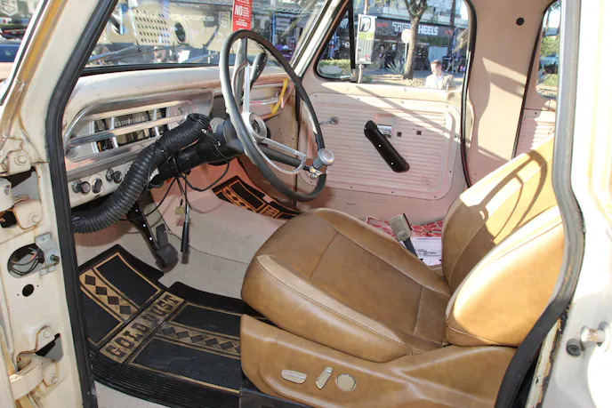 Inside, the truck blends modern comfort with classic vibe. Seats and a center console from a 2018 Ford F-150 have been integrated and wrapped in Apex Leather. The dash features Dakota Digital RTX gauges, while Restomod Air A/C and a JL Audio system with dual 13.5-inch subwoofers bring modern amenities into the mix.