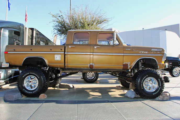 The suspension setup delivers both height and functionality. Up front, Skyjacker ADX 2.5 remote-reservoir coilovers work with custom radius arms and additional components from RuffStuff Specialties and Artec Industries. The result is a towering 16 inches of lift.