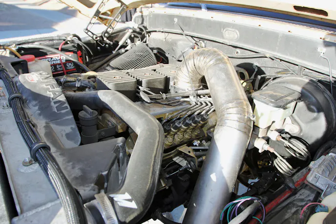 Solomon and his friend handled the engine install themselves after the original 12-valve in the truck suffered a crankshaft failure. Supporting components include a Mishimoto radiator, oil cooler, and transmission cooler, along with a modified core support and an Antigravity battery. The result is serious output, with an estimated 600 horsepower and 1,100 pound-feet of torque.