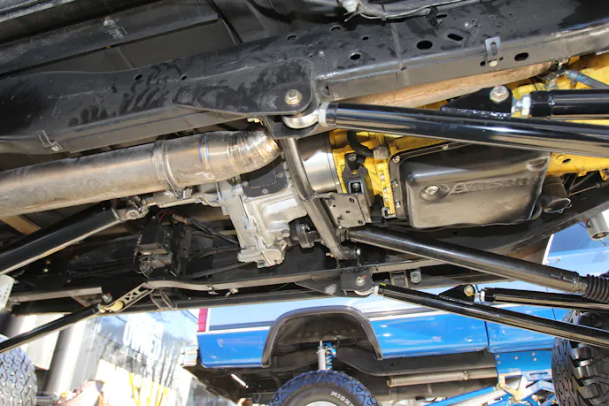 All that diesel torque demands a stout drivetrain. A Custom Automatic Conversions-built Allison 1000 automatic transmission answers the call, reinforced to handle the Cummins’ output. Behind it sits an NP205 transfer case rebuilt with billet internals, delivering strength and reliability.