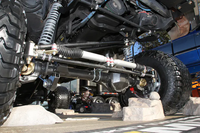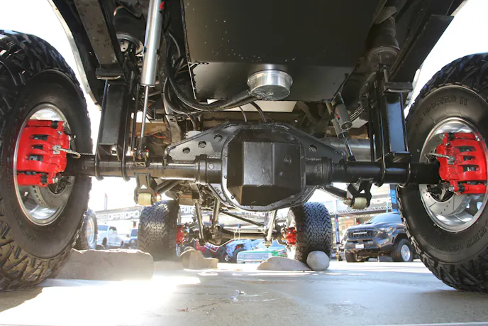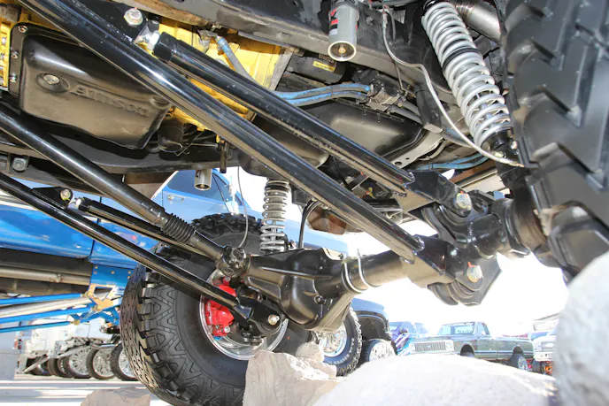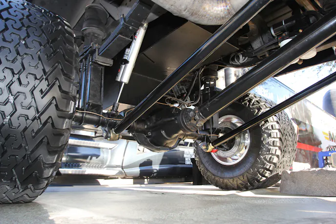 The Dana 60 is heavily upgraded with an Eaton Detroit Locker, Warn manual locking hubs, custom knuckles, and chromoly axleshafts. It also features an Artec Industries diff cover, high-steer kit, and trailing arm system. Supporting components include a Thuren Fabrication 6-inch drop sway bar, dual Skyjacker steering stabilizers, and 2.5-inch RuffStuff Specialties radius arms.