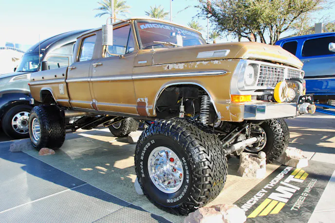 The truck rides on Mickey Thompson Baja Belted II tires in 18.5/39R17LT, mounted on MT Classic Forged wheels measuring 16 inches wide.