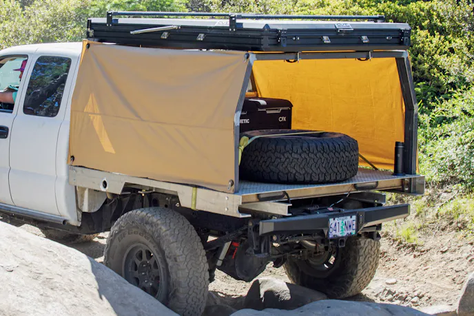 Out back is a slick flatbed that Colin and Solid Fab Works are building together. These photos show the temporary configuration used for the Rubicon Trail. Hoops served as a mounting point for the CVT rooftop tent, and a canopy helped keep gear and the Dometic CFX fridge-freezer out of the elements. The rear bumper includes a two-inch hitch receiver, and there’s a rear-mounted Warn ZEON 12-S winch.